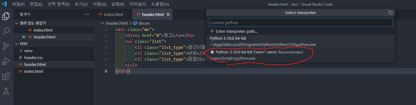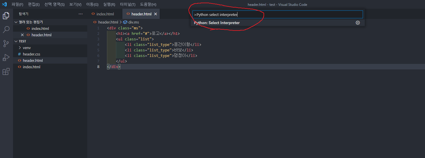 - command palette에서 Python Select Interpreter를 입력, 리스트 내 파이썬 venv를 선택