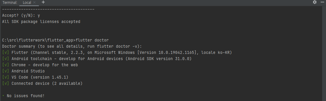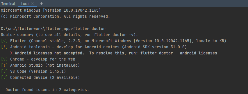 Flutter Doctor 는 플러터 설치 및 설정이 정상적으로 되었는지 환경을 검사해주는 도구임