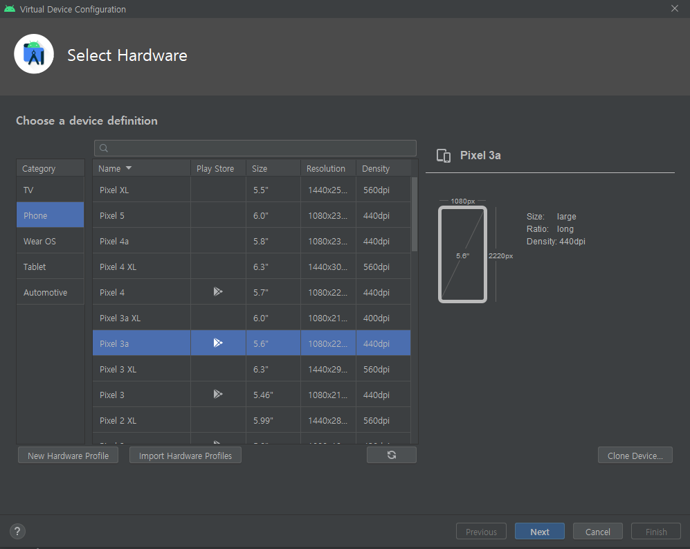 4) 에뮬레이터 생성 완료(Finish 버튼 클릭)