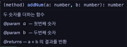 위와 같이 주석을 작성한 후 해당 함수에 마우스를 올려보면 아래 사진과 같이 해당 함수에 대한 설명(파라미터 타입은 무었인지, 어떤 파라미터를 줘야하는지, 어떤 기능을 하는 함수인지, 리턴값은 무었인지 등)을 볼 수 있어 참 편리하다!! 디버깅 할때에도 정말 좋다.