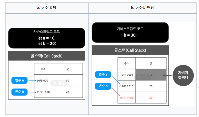 - 원시 타입 : 변수 a에 값 10을 저장했을 경우 콜 스택의 값에 10이 그대로 저장된다.