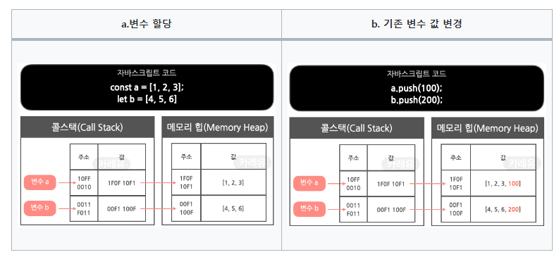 위에 이미지를 보며 변수를 할당하고 Js API인 push()함수를 통하여 값을 추가하면 원시 타입처럼 불변성이 지켜지지 않는다. 그 이유는 변수 a, b가 바라보고 있는 콜스택의 값이 변경되는것이 아닌, 메모리 힙에 있는 데이터가 변경이 되기 때문이다.