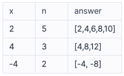- 함수 solution은 정수 x와 자연수 n을 입력 받아, x부터 시작해 x씩 증가하는 숫자를 n개 지니는 리스트를 리턴해야 합니다. 다음 제한 조건을 보고, 조건을 만족하는 함수, solution을 완성해주세요.