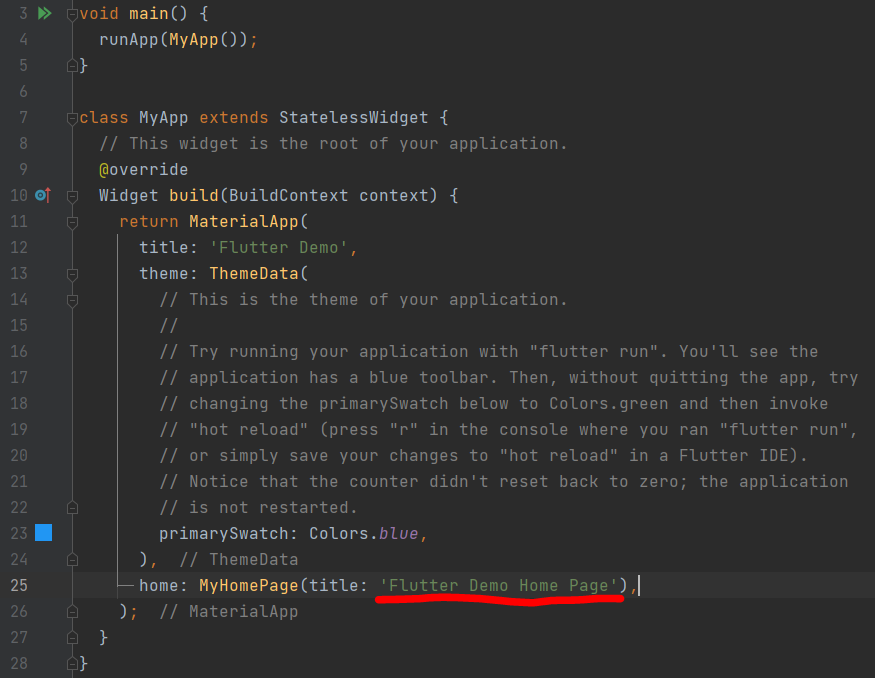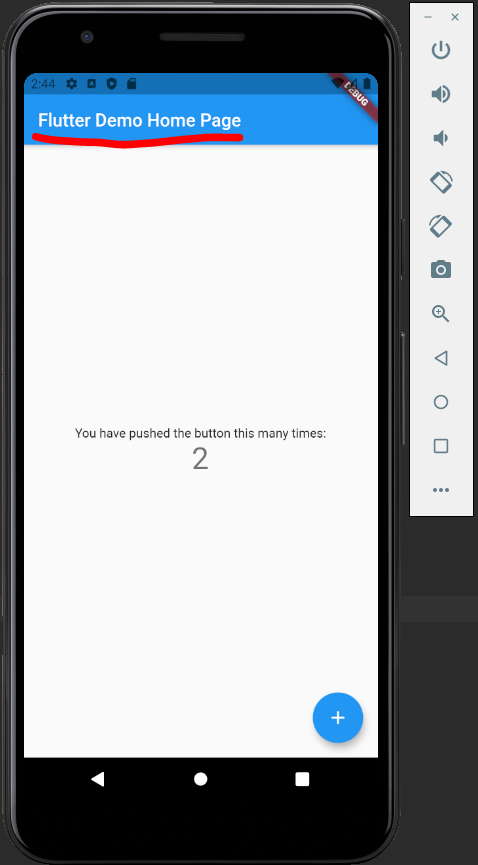 위 코드를 실행시 앱바 부분에는 Flutter Demo Home Page라고 나타난다.