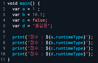 Dart 에서 변수 선언할 때 var 와 dynamic 키워드를 지원한다.