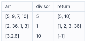 divisor로 나누어 떨어지는 element가 하나도 없다면 배열에 -1을 담아 반환하세요.